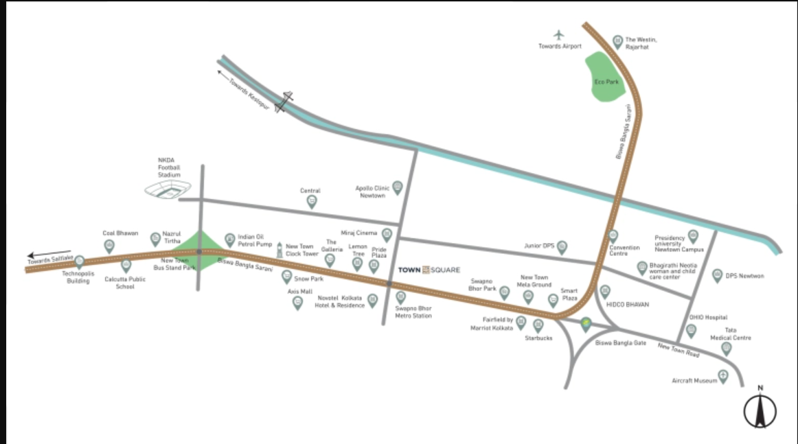 Srijan Newtown legacy continues with an exquisite living, now at the epicenter of Action Area I on Major Arterial Road opposite Novotel.Townsqaure Kolkata has all your coming-of-age lifestyle aspirations covered with supersized living spaces and breathtaking views, complemented with a feast of amenities. And it goes without saying that its heart is curated with greens.One of the best promising and vibrant location spread across acres of land parcel offering unmatched location and unparalleled connectivity. It is a well-planned locality surrounded by New Town Action Area II, (Upcoming CBD) Salt Lake Sector V and this location is the next premium hub of knowledge, culture and technology.